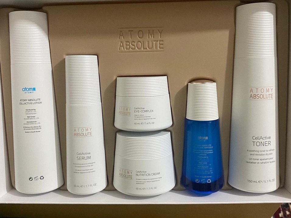 Atomy Absolute set, CellActive Serum, Eye-Complex ve Nutrition Cream ile cildi besleyip canlandırır. Mavi şişe ekstra bakım sağlar.