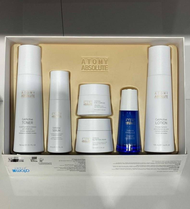 Atomy Absolute cilt bakım seti, tonik, serum, losyon ve kremler içerir. Cildi temizleyip besleyen yumuşak ve nemlendirici formüllerle kutuda sunulur.