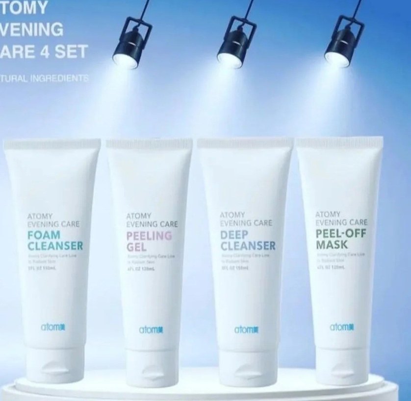 Atomy Akşam Bakım Seti, derin temizleyici, peeling jeli ve soyulabilir maske içerir, yüz temizliği ve peeling için uygundur.