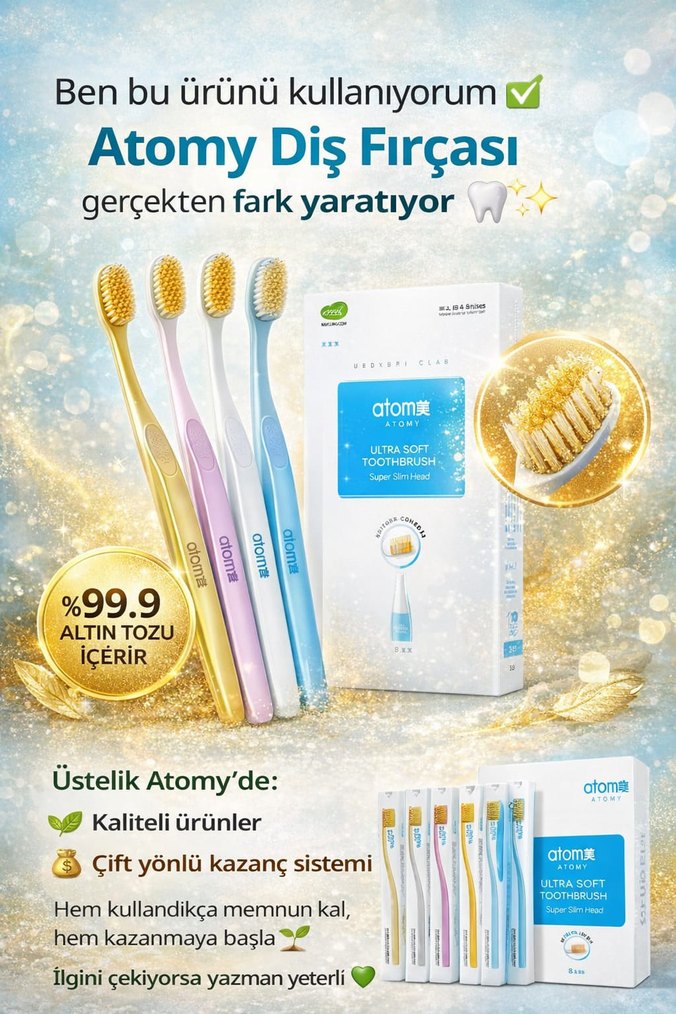 Atomy diş fırçası %99,9 altın tozu içerir ve ultra yumuşak kıllara sahiptir. Kaliteli ürün ve çift yönlü kazanç sistemi sunar.