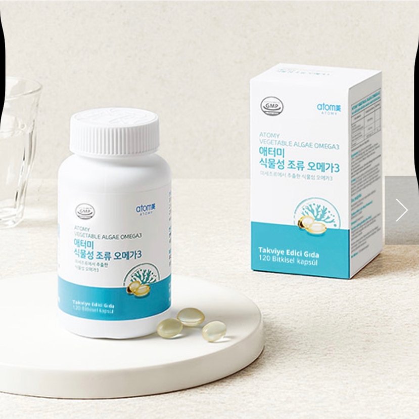 Atomy Bitkisel Omega 3 kapsülleri, parlak beyaz plastik şişede, baskılı etiketle sunulur. Sağlığı destekleyen 120 bitkisel kapsül içerir.