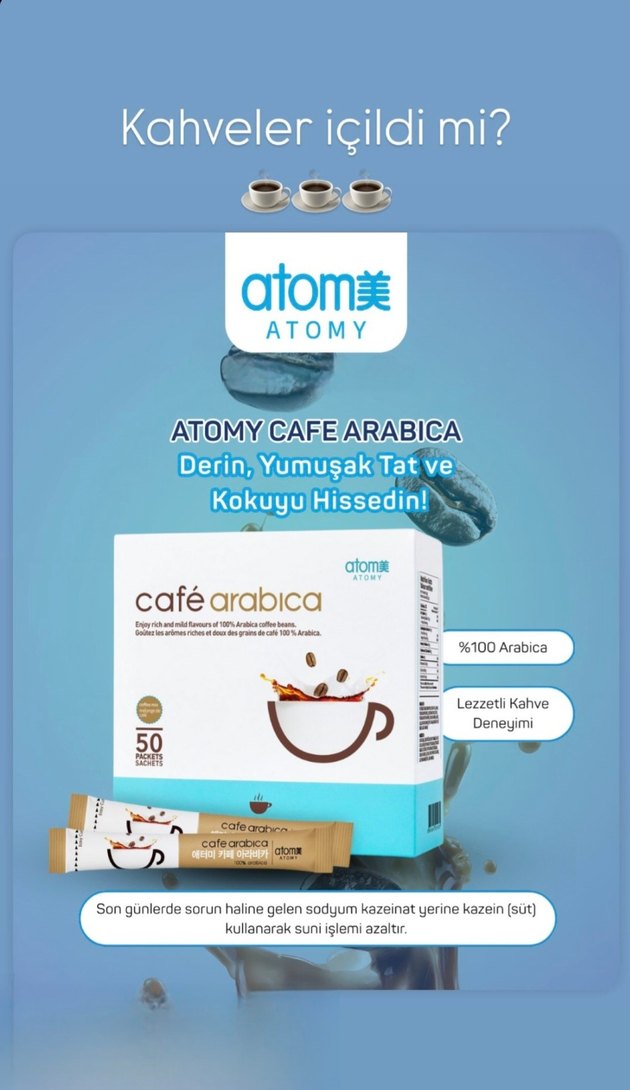 Atomy Cafe Arabica, %100 Arabica çekirdeklerden derin ve yumuşak tat ile kokuyu sunar. Sodyum kazeinat yerine süt kazeini kullanarak yapay işlemi azaltır. ☕