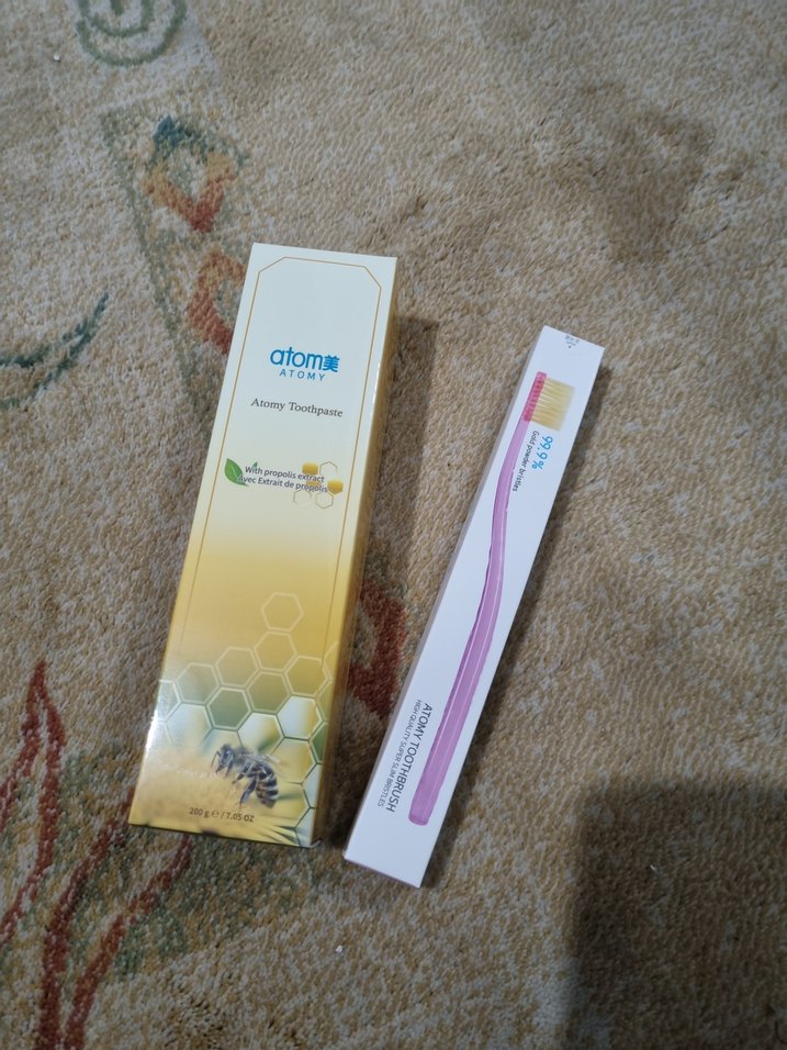 Atomy diş macunu propolis ve arı sütü özleri içerir, yanında yumuşak kıllı pembe-beyaz diş fırçası bulunur.