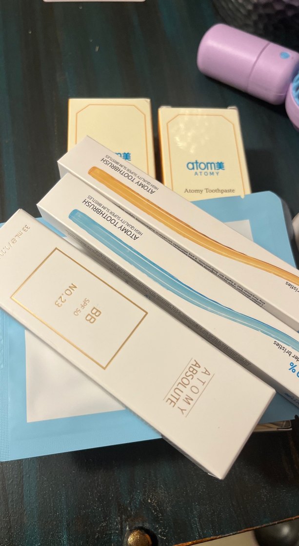 Atomy diş macunu ve orta sertlikte diş fırçası içeren set, etkili ağız bakımı sağlar. Ambalaj sade ve temizdir. Bb 50 koruma faktörlü güneş kremi ve sıkılaştırıcı maske