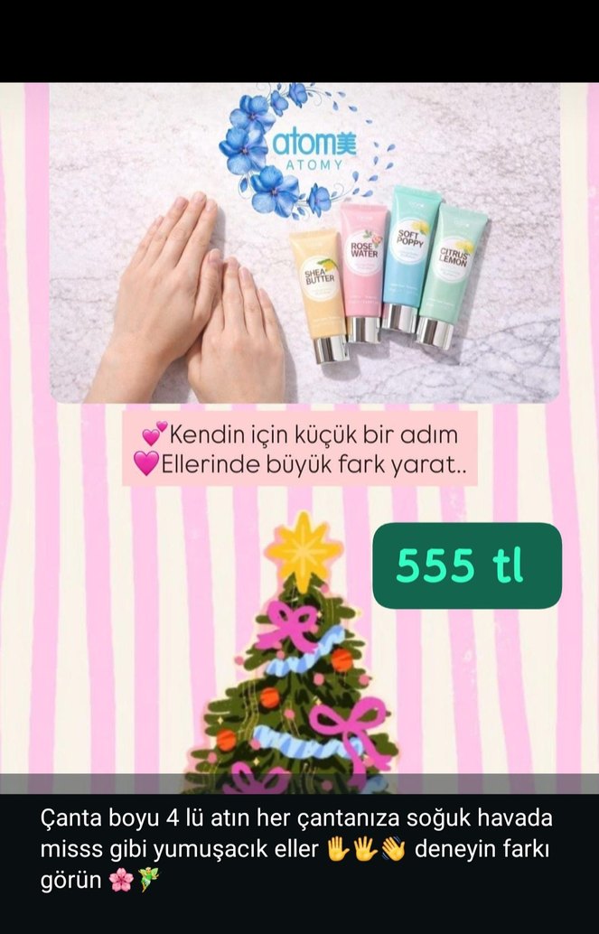Atomy'nin çanta boyu 4'lü el kremi seti, soğuk havada ellerinizi yumuşak ve mis gibi yapar. Her çantaya kolayca sığar. ️ 100 tl kargo ücreti