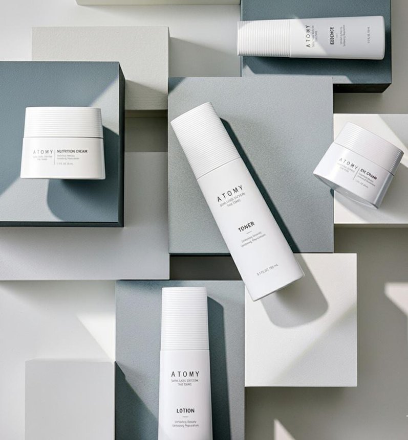 Atomy erkek cilt bakım setinde losyon, tonik ve besleyici krem bulunur, şık beyaz ambalajda günlük bakım için uygundur.