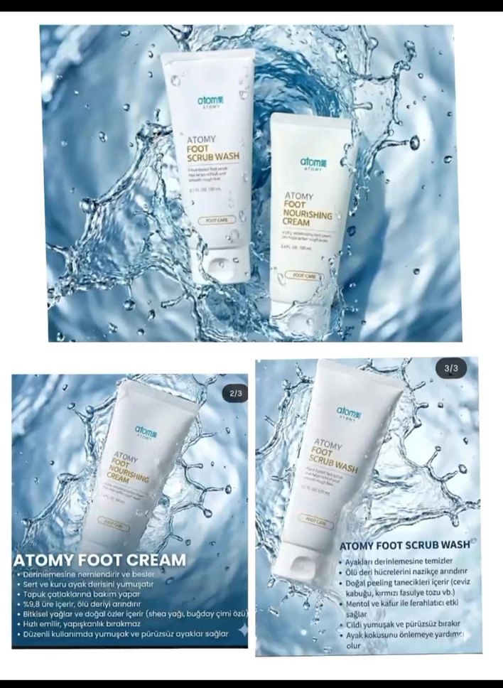 Atomy Foot Scrub Wash ve Nourishing Cream, erkek ayaklarını nazikçe temizleyip besler. Ölü deriyi arındırır, ayakları yumuşak ve ferah tutar. Düzenli kullanımda koku oluşumunu önler. 1350 tl altı 100 tl ayak bakım seti jel 480tl krem 444 tl