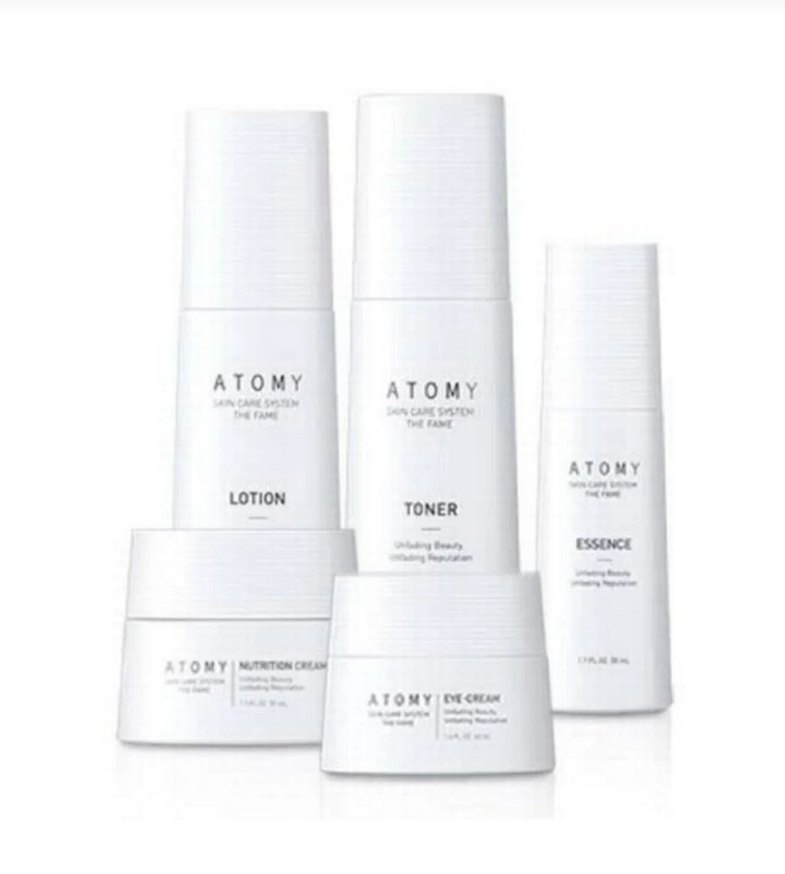 Atomy Fame cilt bakım seti; losyon, tonik, esans, besleyici krem ve göz kremi içerir.