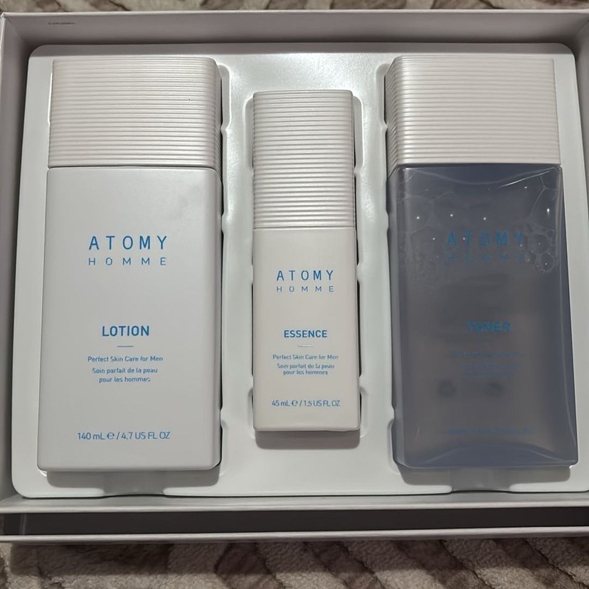Atomy Homme erkek cilt bakım seti, losyon, öz ve tonik içerir. Erkekler için mükemmel cilt bakımı sağlar.