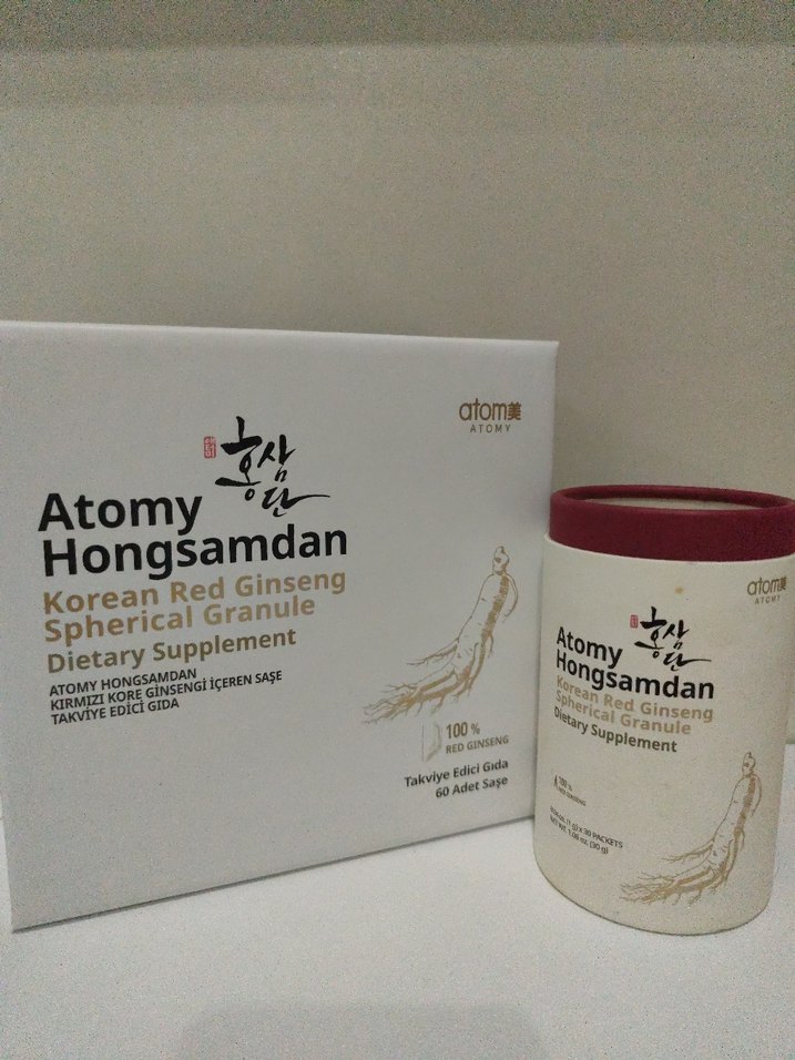 Atomy Hongsamdan, Kırmızı Kore Ginsengi içeren küresel granüllerle doğal sağlık desteği sağlayan bir besin takviyesidir. 3 paket var elimde .toplu alımda indirim yaparım. uygun fiyatadır.