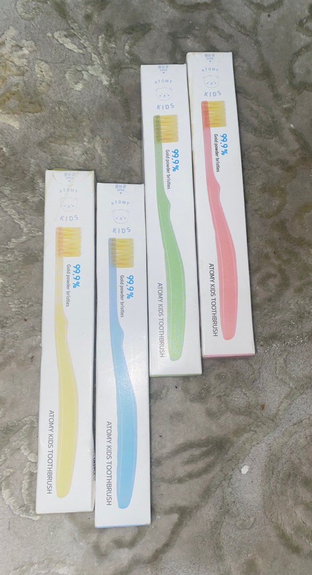 Atomy Kids çocuk diş fırçaları, yumuşak kıllara sahip dört renkte, çocuk dişleri için uygun ve %99,9 temizlik sağlar.