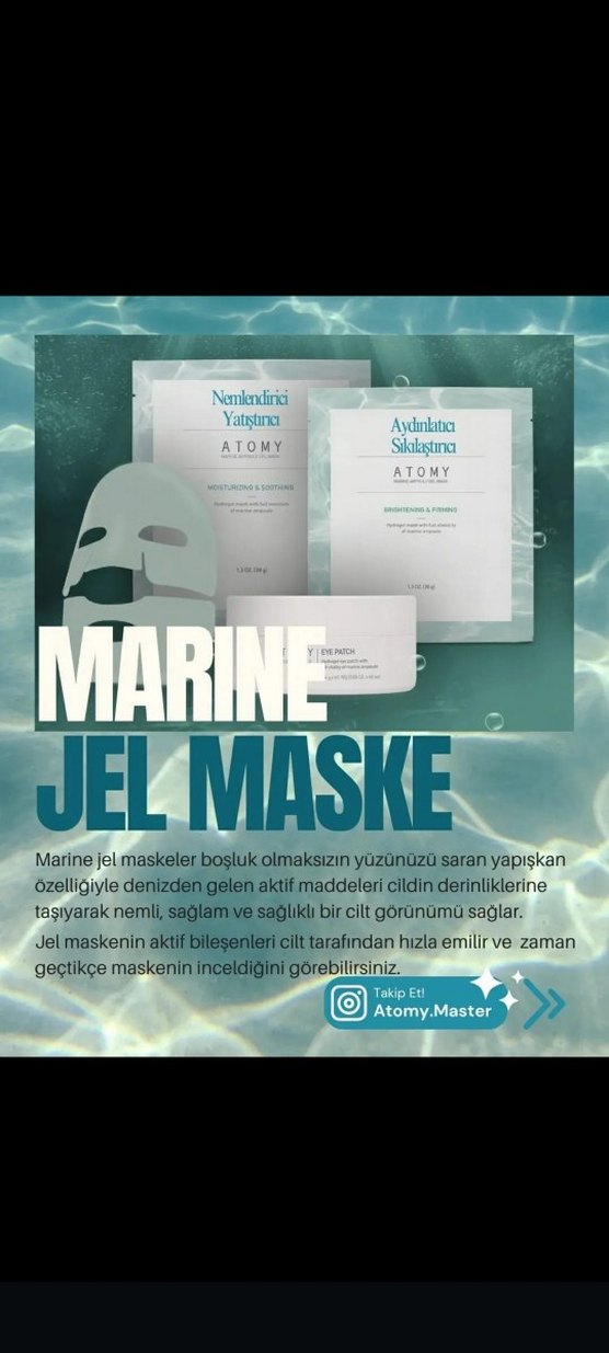 Atomy Marine jel maskeler, denizden gelen aktif maddeleri cilde derinlemesine taşır. Yapışkan yapısıyla yüzü sarar, nemlendirir ve sağlıklı görünüm sağlar. Jel maskenin aktif bileşenleri hızla emilir.kutu içerisinde 10 adet maske mevcuttur sıkılaştırıcı ve aydınlatıcı olarak iki çeşit vardır tercihinizi yazarsanız yardımcı oluruz Dünyaca ünlü Kore ürünlerini denemek veya sizde bu işten para kazanmak isterseniz mesaj atabilirsiniz fiyat temsilidir