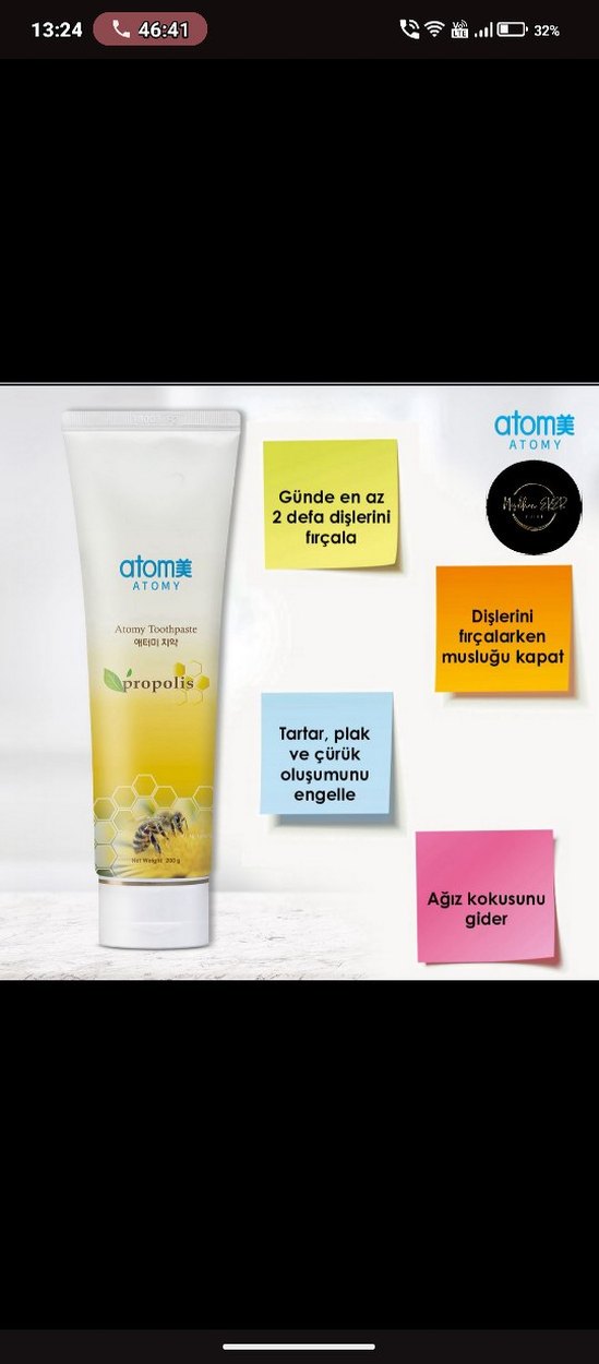 Atomy Propolis diş macunu, tartar, plak ve çürük oluşumunu engeller. Ağız kokusunu giderir. Günde en az 2 defa dişleri fırçalamayı ve fırçalarken musluğu kapatmayı önerir.