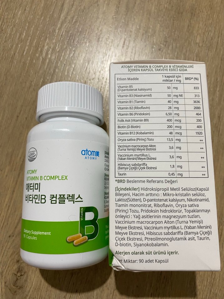 Atomy Vitamin B Complex, B vitaminleri, bitki özleri ve mineraller içerir. Şişede 90 kapsül bulunmaktadır. Atomy Vitamin B Complex, enerji üretimi, sinir sistemi sağlığı ve genel sağlık desteği gibi faydalar sunar. Ürün vegan, glütensiz ve GDO’suz özelliklere sahiptir. Ürün Özellikleri • İçerik: B1, B2, B3 (niasin), B5, B6, B7 (biotin), B9 (folik asit) ve B12 vitaminlerini içerir. Ayrıca, yaban mersini, kızılcık ve hibiskus gibi bitki özleri ile desteklenmiştir. • Kapsül Sayısı: Her kutuda 90 adet 450 mg’lık kapsül bulunur. • Kullanım: Günlük 1 kapsül önerilir.
