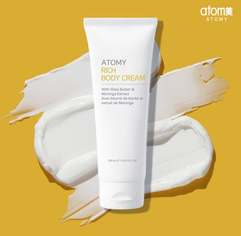 Atomy Zengin Vücut Kremi, shea yağı ve moringa özü ile cildi derinlemesine besleyip nemlendirir. 200mL tüpte sunulur.