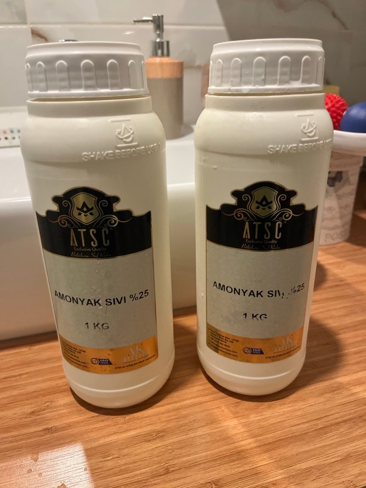 ATSC markalı, %25 yoğunlukta 1KG amonyak sıvısı, çeşitli temizlik işlemleri için uygundur. Sadece bir tanesini bir kez kullandım. Kokusu çok yoğun etkisi mükemmel 1 damla bile yetiyor. orijinal üründür. Harika temizlikler için kullanılır anında etkisini gösterir. Diğer satılan sitelerdeki markalarla kıyaslamayınız çok iyi üründür iyi bir yerden almıştım. Evde bebek olduğu için riske atmak istemedim o yüzden satıyorum. 1 lt fiyatıdır. İstenilen durumda 2 adet ayarlanıp gönderilir. Hemen kargolanır.