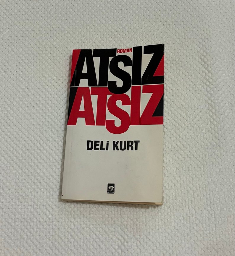 Atsız'ın "Deli Kurt" romanı, beyaz zemin üzerinde siyah ve kırmızı tipografiyle dikkat çekici bir kapak tasarımına sahiptir. Kitap genel olarak iyi durumda.