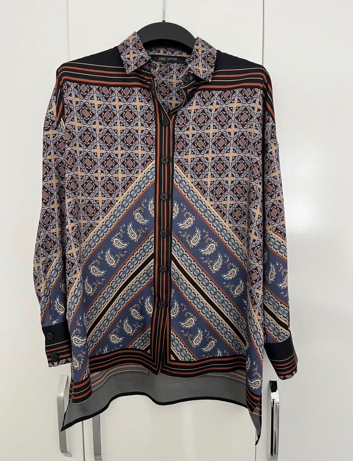 Kadınlar için desenli bohem tarzda, uzun kollu ve yakalı gömlek. Rahat kesim, normal midi boy ve düğmeli ön detaylı. Çok renkli, koyu tonlarda tekstil kumaş, günlük kullanıma uygun. Koleksiyon ürünü. 2 kez giyildi. Sağ ve sol tarafta askıdan dokayı ip çekmesi var. Harici sorunsuz. Koltuk altı eni: 60 Boy:74 cm