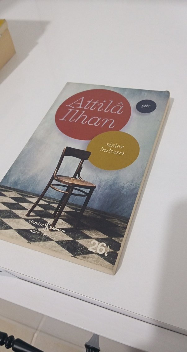 Attilâ İlhan'ın Sisler Bulvarı adlı şiir kitabı, üzerinde ahşap sandalye ve kareli zemin bulunan sade bir kapak tasarımına sahiptir.