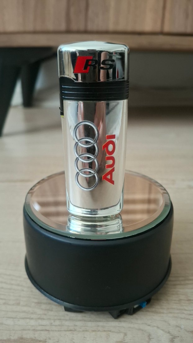 Audi logosu ve parlak gümüş kaplaması olan metal Audi RS çakmak, siyah ve kırmızı detaylarla dikkat çekiyor. Yuvarlak siyah taban üzerinde şık ve kullanışlı.