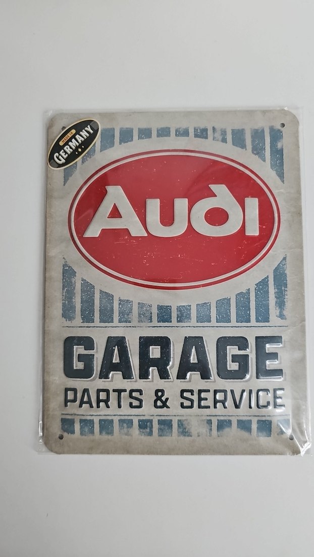 Audi logosu ve "GARAGE PARTS & SERVICE" yazılı gri tonlarda vintage metal rozet. Eskitilmiş görünümüyle dikkat çeker. Orijinal.