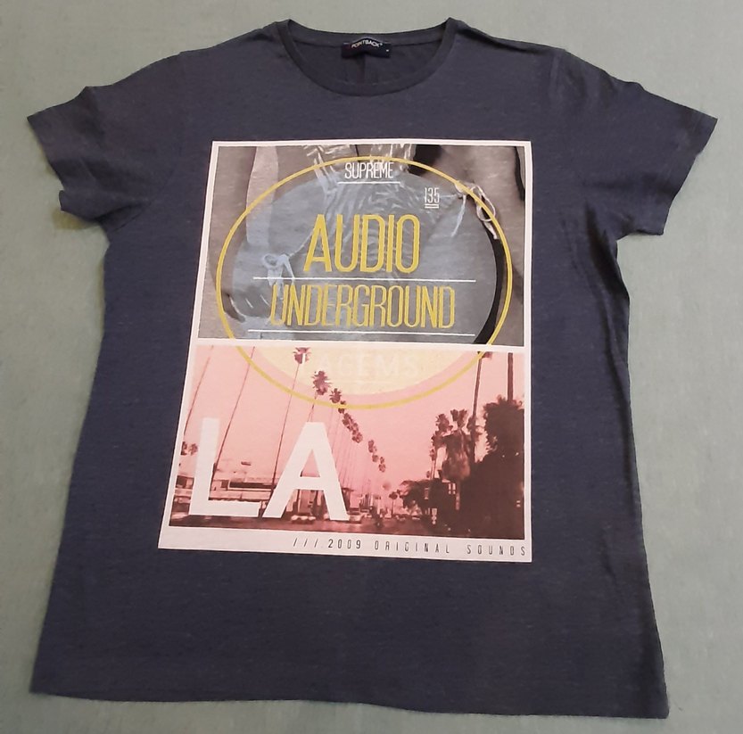 Koyu renkli, üzerinde 'Audio Underground' yazısı ve 2009 tarihli LA palmiye ağaçları görseli bulunan baskılı tişört. Temiz, sorunsuz.