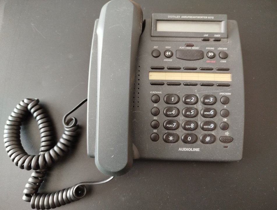 Audioline gri masaüstü telefon, sayısal tuş takımı ve temel fonksiyon tuşlarına sahiptir. Kablolu ahize ve küçük ekran içerir. ☎️