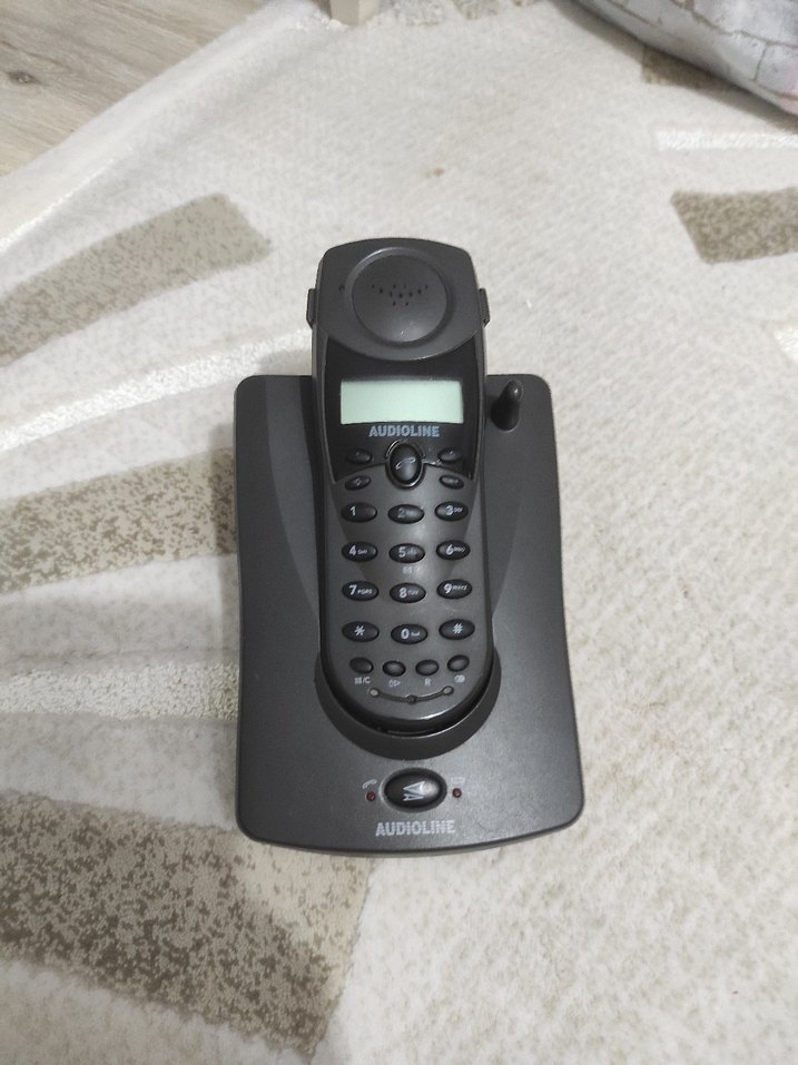 Audioline kablosuz telefon, siyah ve gri renkte, tuş takımı ve arayan bilgisi için küçük ekrana sahiptir. Şarj ünitesi üzerinde kullanılır.