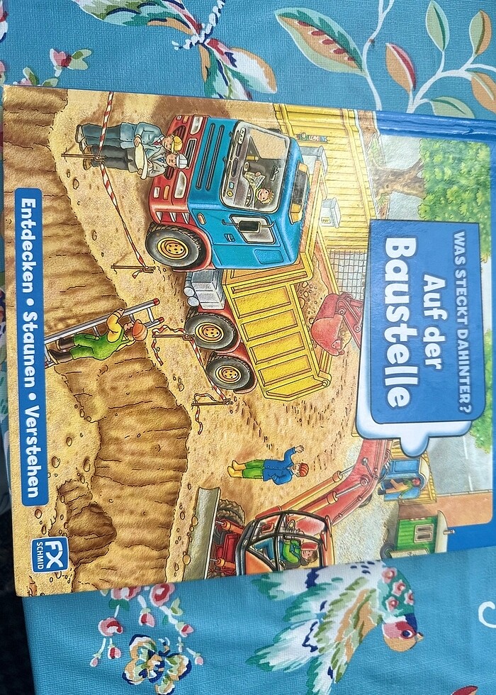 Kalın karton kitap. Açılır kapanır pencereleri var. İnşaat ile ilgili meslekleri anlatıyor. Almanca.