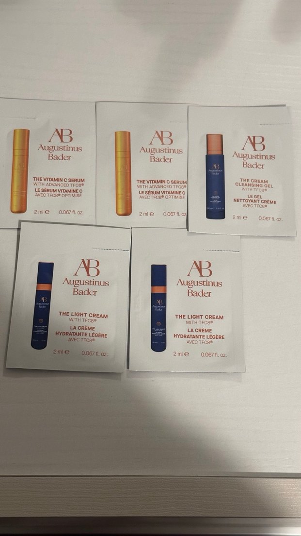 Augustinus Bader'ın açık ton camel renkli BB krem örnekleri, Vitamin C Serumu ve TFC8® içeren Nemlendirici ve Temizleyici krem ürünleriyle.