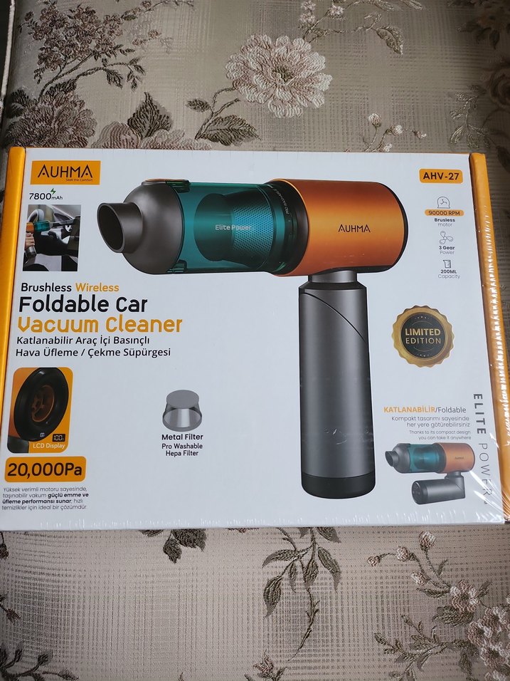 AUHMA AHV-27 katlanabilir, kablosuz araç süpürgesi. 20.000Pa emiş gücü, fırçasız motor, hava üfleme ve çekme özellikli. Metal yıkanabilir HEPA filtre içerir.