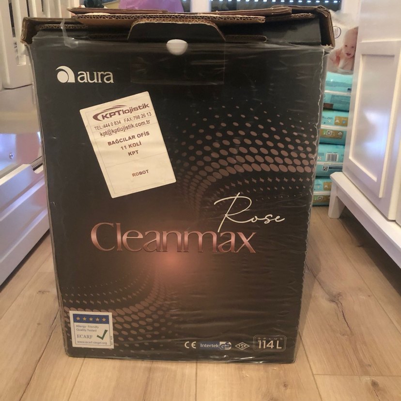 Aura Cleanmax Rose, siyah renkte otomatik robot süpürgedir. Kompakt kutusunda marka ve lojistik bilgileri yer alır.fiyat 65 bin
