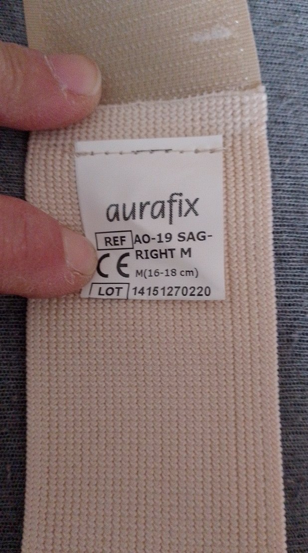 Aurafix marka, sağ bilek pedi, bej renkte, M beden (16-18 cm) ölçüsünde. CE işaretli, REF A0-19 SAG, LOT 14151270220.