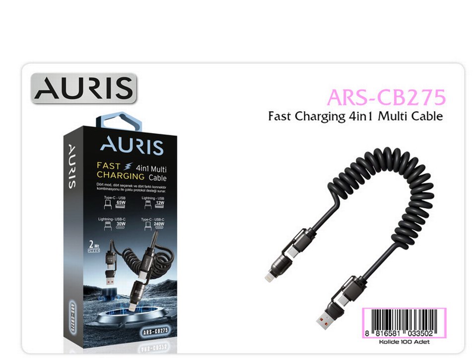 AURIS ARS hızlı şarj kablosu, renkli detaylara sahip 4'ü 1 arada çoklu konnektör tasarımına sahiptir. USB-C, Lightning ve USB bağlantılarını destekler. Siyah spiral kablo, pratik kullanım ve hızlı şarj sağlar.