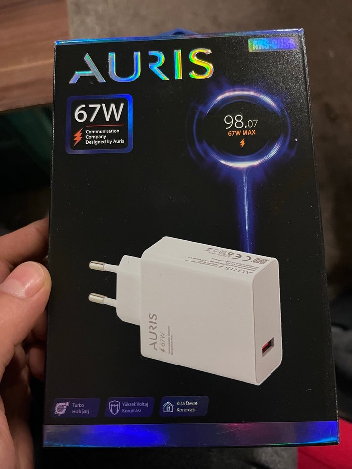 AURIS 67W hızlı beyaz telefon şarj cihazı, yüksek voltaj ve kısa devre koruması ile güvenli ve hızlı şarj sağlar. ⚡