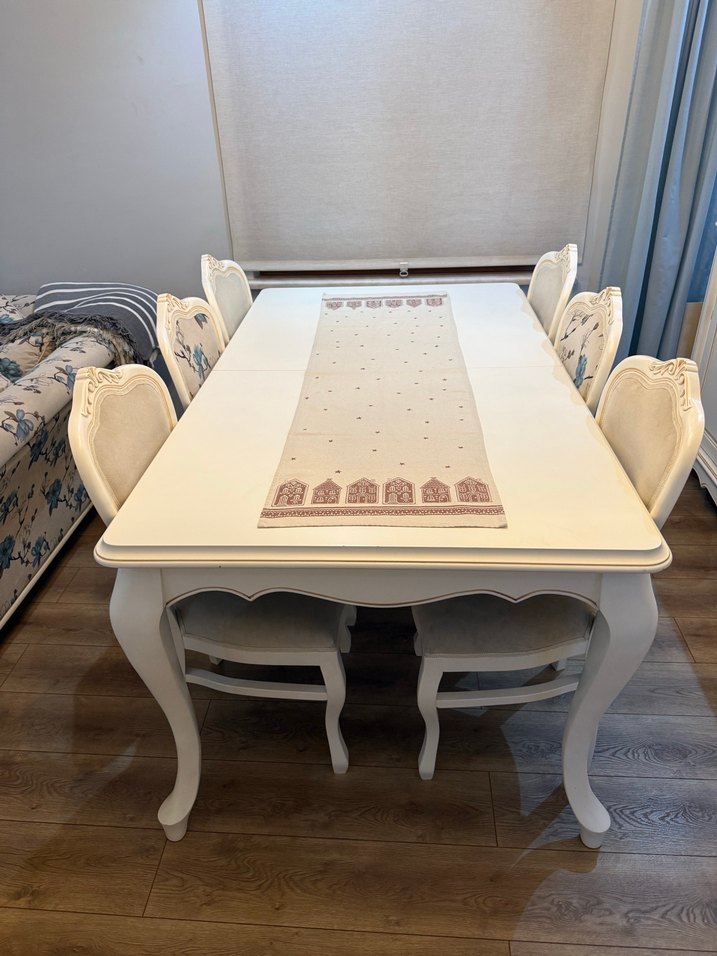 Salon takımıyla beraber alınmıştır. Çizik deforme yoktur. Köşede taşırken ufak iz olmuş görünmeyen dikkat çekmeyen ama yüzeyde bir şey yok lakedir lukens ayaklı klasik bir masa sandalye takımıdır. Siteler ürünüdür sağlamdır. Açılınca baya büyüktür kapalı hali ise görüldüğü gibidir. 6 tane sandalyesi vardır. Takım olarak alınmak isterse koltuk takımı da ayrıca ilandadır.