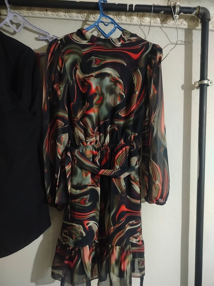 Koyu renkli çok renkli batik desenli, uzun kollu ve yüksek yakalı, drapeli, vücuda oturan mini elbise. Günlük kullanıma uygun, çağdaş tasarım. ✨ bence 36 bedene de uygun bir elbise. s giyen herkes rahatlıkla giyebiliirr