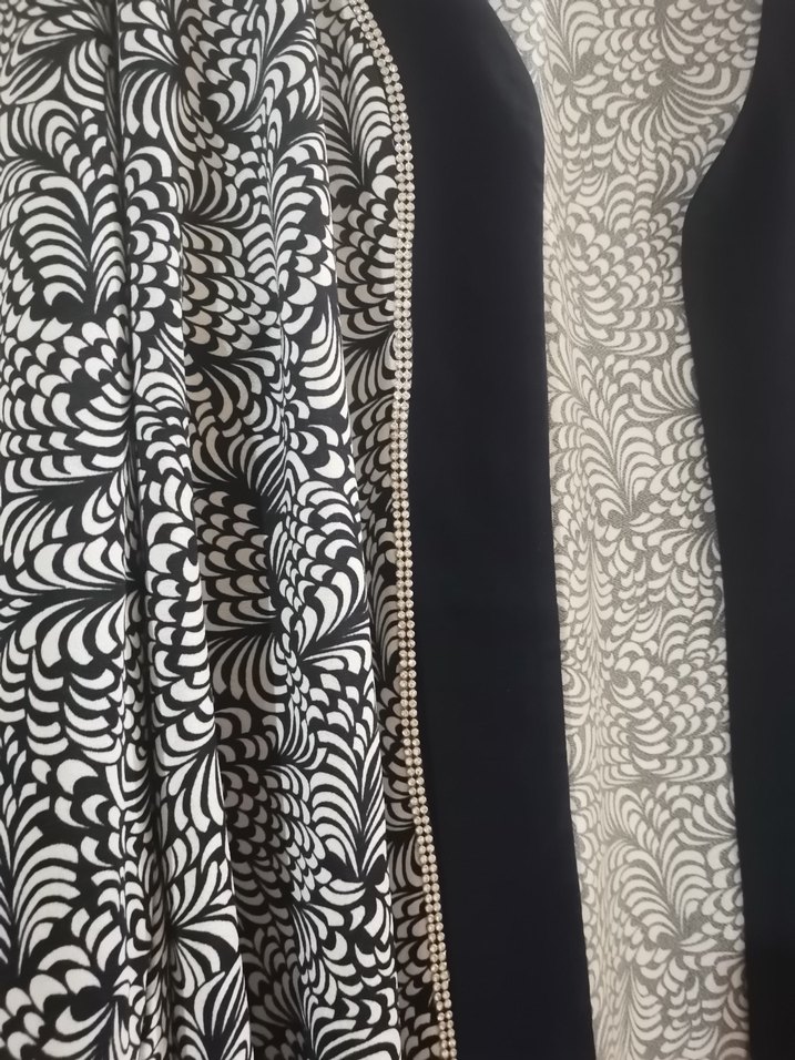 Kadınlar için siyah ve gri tekstil malzemeden yapılmış, drapeli avant-garde desenli çağdaş tarzda şal.