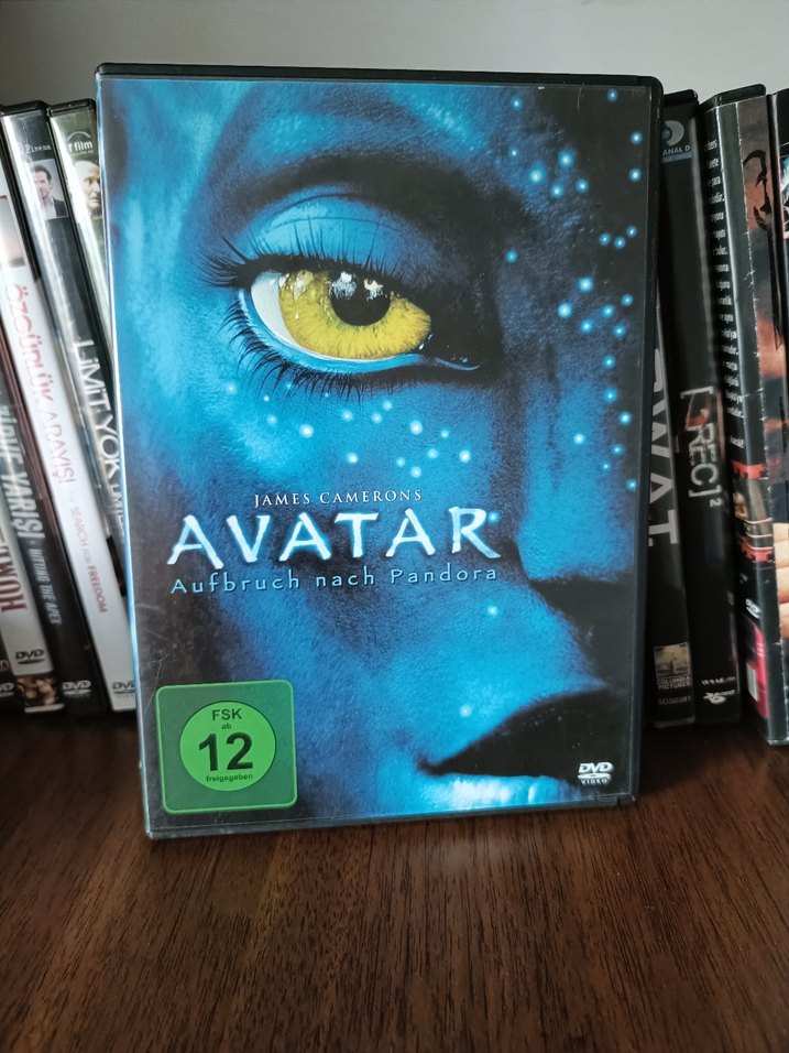 James Cameron'ın Avatar filmi DVD'si, kapakta sarı gözlü mavi Na'vi yüzünü gösterir. FSK 12 yaş sınıflandırmasına sahiptir.