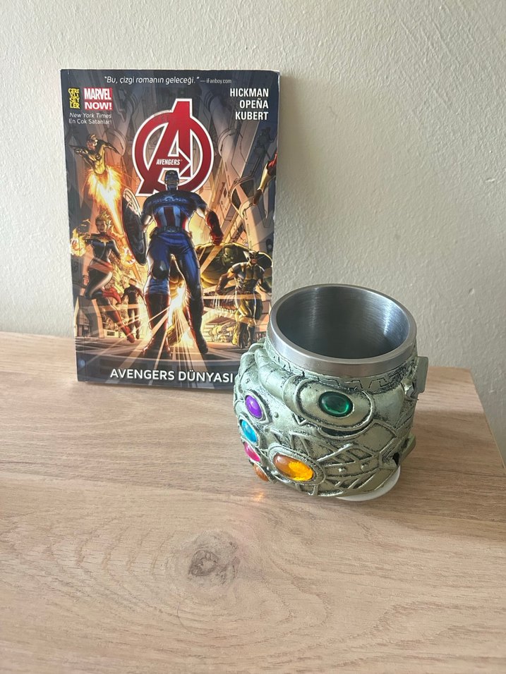 Ürünler s@tılmıştı maalesef kargoda kupanın sapı kırıldı, o yüzden fiyatını güncelledim. Marvel hayranları için hem görsel hem de içerik dolu bu özel set, Jonathan Hickman’ın kaleminden çıkan ve Marvel Now! serisinin en sevilenlerinden olan "Avengers Dünyası" çizgi romanı ile Thanos'un ikonik Sonsuzluk Eldiveni (Infinity Gauntlet) tasarımlı kupadan oluşmaktadır. Çizgi roman tertemiz kondisyonda, eksiksiz ve yırtıksızdır; kupa ise içi paslanmaz çelik, dışı ise yüksek detaylı kabartma ve taş işçiliğiyle hem günlük kullanıma hem de masaüstü dekorasyonuna uygun, oldukça kaliteli bir parçadır. Koleksiyon değerini artırmak isteyenler veya sevdiği birine unutulmaz bir hediye arayanlar için kusursuz durumda olan bu ikiliyi kaçırmayın