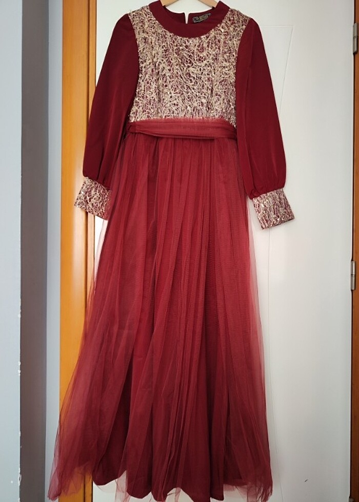 İki üç kere giyildi. İki kere temizlendi. Herhangi bir kusuru yoktur. Şık ve sade. Her türlü özel güne uyumlu. Fotoğraflarda göründüğü gibidir. #abiye #tül #şifon #gold #bordo