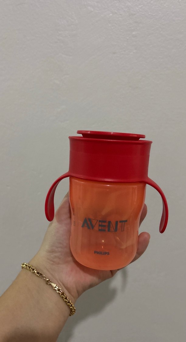 Kırmızı Avent bebek biberonu, kolay tutuş için kulplu ve güvenli kapaklıdır, rahat besleme sağlar. Bikaç kez kullanıldı