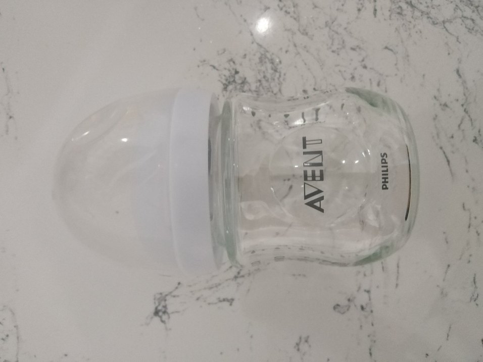 Avent cam bebek biberonu beyaz kapak ve gri detaylara sahip şeffaf gövdesiyle kolay besleme sağlar.