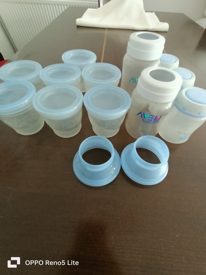 Avent marka 7*180 ml anne süt saklama kabı,3*150 ml Nuk marka sut saklama kabı,iki adet Avent marka biberon ve iki adet adaptör
