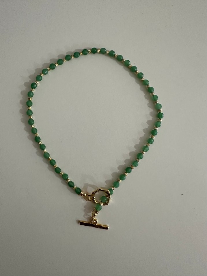 Aventurin ve dorika boncuklardan oluşan el yapımı doğla yaş kolye sade ve bohem tarzda, günlük kullanıma uygun midi uzunlukta kadın kolye. Toggle kapamalı.