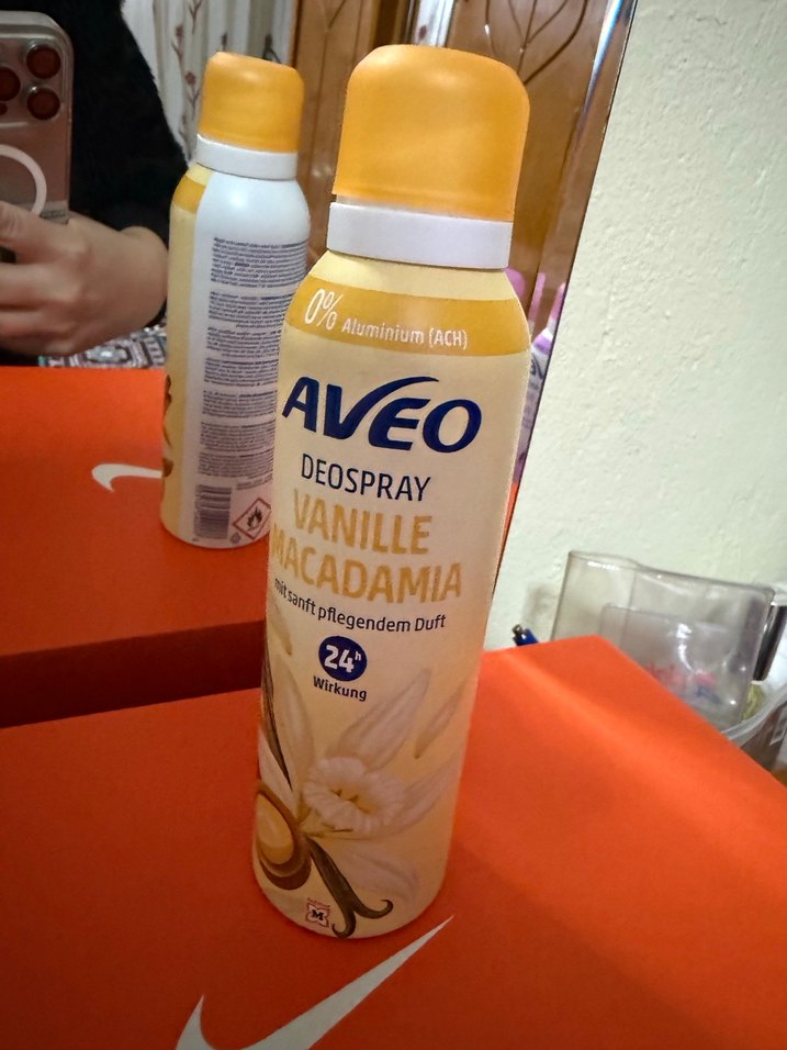 Aveo kadın deodorant spreyi, vanilya ve macadamya kokusuyla 24 saat koruma sağlar, alüminyum içermez. 200 ml büyük boy