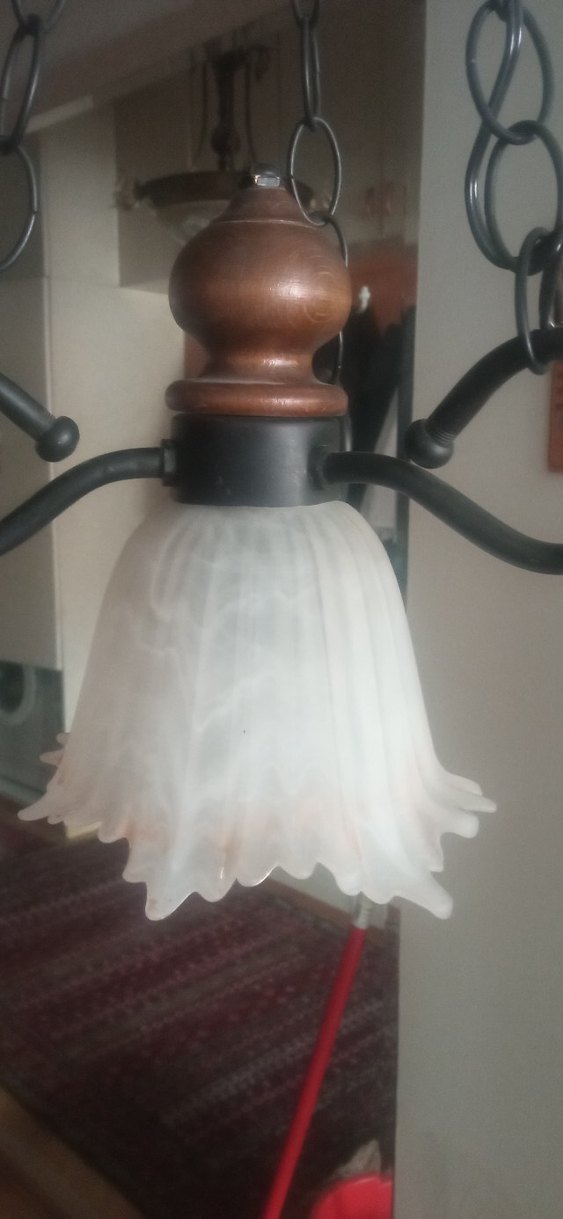 Ahşap detaylı, dalgalı formda mat bej camlı avize al. Hafif ve yumuşak ışık sağlar.