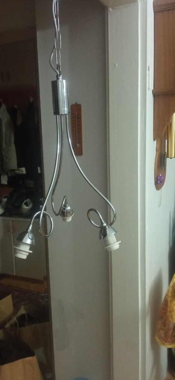 nikelajlı ve gri tonlarda, üç ampul yuvası bulunan modern, kıvrımlı tasarımlı avize. Hafif aydınlatma için uygundur. e14 duylu camları yok