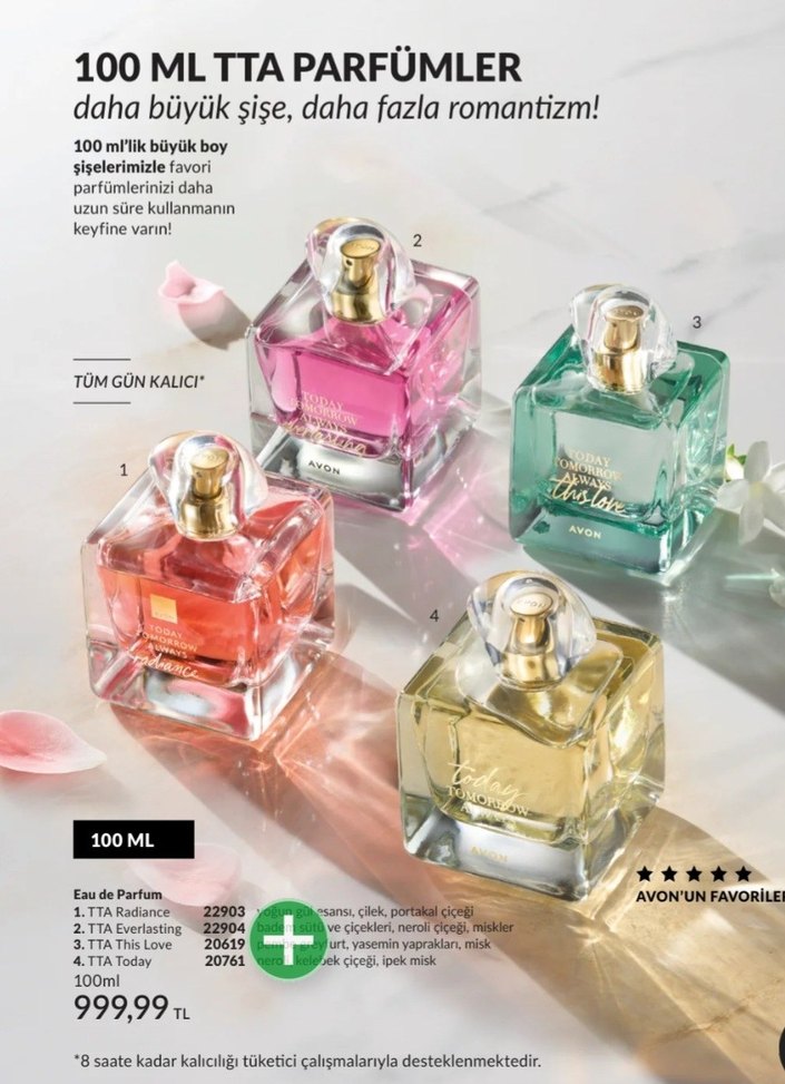 Avon'un 100 ml Eau de Parfum şişeleri, çiçeksi, narenciye ve misk notalarıyla 8 saate kadar kalıcı kokular sunar. Romantik dokunuşlar içerir.
