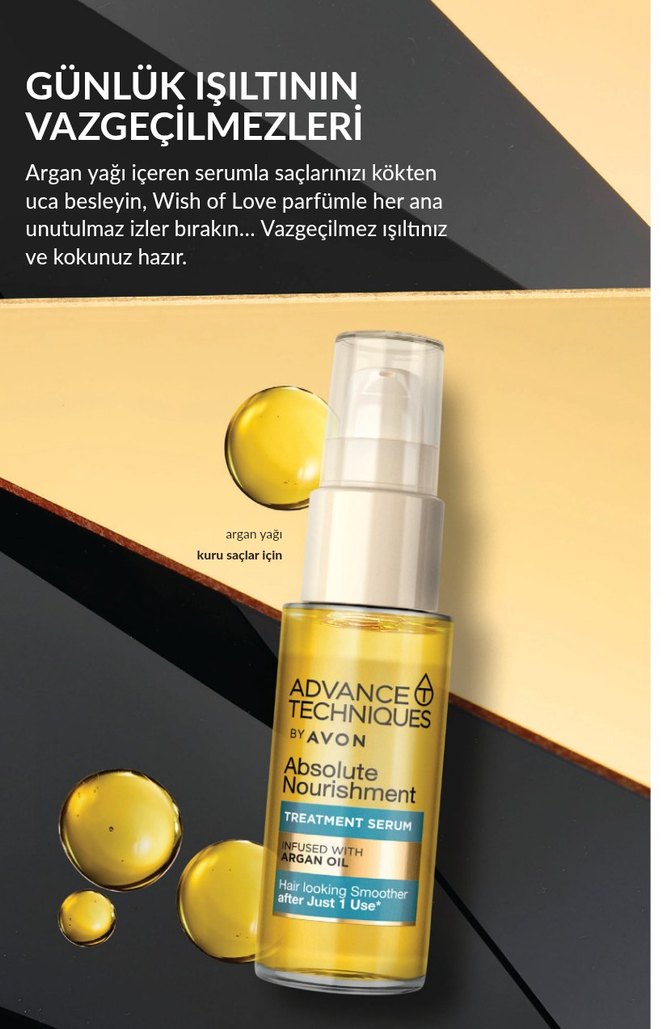 Avon Advance Techniques serumu, argan yağı ile saçı kökten besler, kalıcı parlaklık ve Wish of Love kokusu sağlar. Kuru saçlar için uygundur. ✨